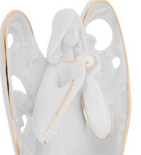 Фигурка ангела в просторных одеждах как будто вырастает из основания подсвечника. Два стилизованных ангельских крыла распахнулись за его спиной. Всех, кто присутствует в комнате, озаряет не только свет свечи, теплый и уютный, но и ангельский свет, благодать чистоты, доброты и возвышенных мыслей.