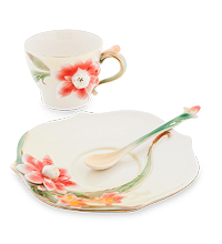 Чашечка и блюдце для чаепития — казалось бы, что может быть проще? Но как много зависит от того, какими они будут. Раскинувшиеся на этой чайной паре яркие цветы георгина, сразу же создают хорошее настроение, изящество приборов делают атмосферу праздничной и изысканной, а любой стол превращается в торжественный, если на нем появляются такие предметы. Чайная пара «Георгин» — это не просо посуда, это уют и красота вашего дома, ваше отношение к себе и своим близким.