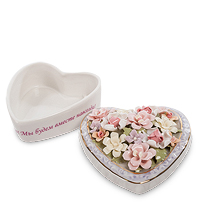 Пожалуй, лучше и красноречивее подарка любимой женщине не придумать. Это одновременно и объяснение в любви – недаром же форма шкатулочки в виде сердечка, и пожелание радости – что еще может символизировать крышка, усыпанная яркими цветами. Это – шкатулка для самых сокровенных вещей, украшений, драгоценностей, да и просто памятных и дорогих сердцу вещичек. И еще надпись по боку шкатулки – настоящее признание в любви!