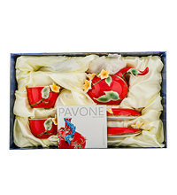 На ярко-красной поверхности сервиза – бело-желтые цветы тропического франжипана. Побеги вырастают из чашек, цветы распустились во всех направлениях, и даже ложечки имеют ручки, выполненные в форме листьев. Везде побеги, листья, цветы – жизнь бушует и приглашает на чаепитие. Поразительным контрастом выступает белая внутренняя поверхность, не мешающая оценивать цвет налитого в чашки чая. Из такой посуды можно пить только с праздничным настроением.