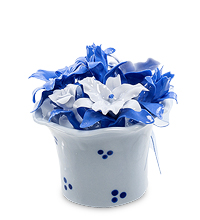 Синий цвет действует успокаивающе и умиротворяющее. В этой низенькой широкой вазе из фарфора, белой с синими точками, собраны необычные цветы – у них синие листья и синие бутоны, на фоне которых выделяется несколько цветов ослепительно белого цвета. Композицию дополняет пышный бант из белой с голубым отливом ленты. Пусть этот букетик явно не пытается казаться естественным: не бывает таких синих цветов и тем более листьев, но ощущение он оставляет приятное, от взгляда на это фарфоровое творение на душе становится спокойнее. Это как абстрактное искусство: видишь что-то непонятное, но за душу оно при этом цепляет.