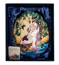 Фарфоровая ваза «Гейша» имеет оригинальную яйцевидную форму. Этот аксессуар имеет художественное оформление в японском стиле. На лицевой стороне вазы мы видим задумчивую девушку в свободно спадающем кимоно. Она сидит на ветви старой магнолии, которая как раз находится в фазе цветения. Помимо больших белых цветов магнолии наше внимание привлекает спокойное синее море, которое находится на заднем плане. На обратной стороне вазы изображены цветы и вода.
