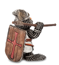 Рыцарь-крестоносец в полном боевом облачении. На голове – шлем, одна рука – на рукояти меча, вторая держит боевой топор. За спину закинут щит с красным крестом, такой же крест украшает и белый плащ, надетый поверх металлической кольчуги. Рыцарь стоит на посту, внимательно всматриваясь вперед, готовый пустить в ход оружие.