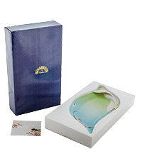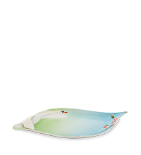 Первое, что бросается в глаза при взгляде на это уникальное изделие — его форма. Словно застывшее в полете лебединое крыло предстает перед нами это блюдо «Лебеди». Мягкий и нежный узор усиливает впечатление: мы видим распластавшегося в полете белоснежного лебедя и проносящуюся под ним прекрасную землю с зеленью, цветами.