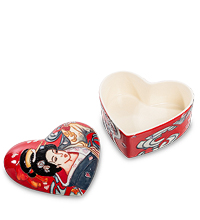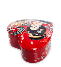 Шкатулка «Гейша», сделанная из керамики, выполнена в виде сердца и покрыта красной краской. На крышечке изображена японка в традиционном женском наряде. Ее волосы красиво уложены и украшены шпильками необычной формы. Помимо японки в кимоно, на коробочке также изображено множество розовых лепестков сакуры.