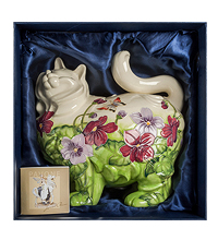 Сама по себе копилка белой кошки простая, но дополняют ее и делают дизайн неординарным яркий зеленый фон нижней части с безумно красивыми цветами и бабочками невероятной красоты. Миловидная кошечка сможет порадовать истинных любителей этих животных.