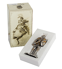 Оловянная фигура выполнена просто мастерски, доспехи отлично разрисованы, на щите имеется герб. Статуэтка воина будет прекрасно смотреться на рабочем столе сильного, уверенного в себе мужчины, но в то же время она отлично впишется и в домашний интерьер, украсив собой книжную полку.