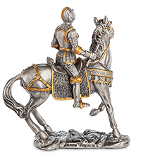 Статуэтка «Средневековый воин на коне», сделанная из олова, изображает всадника верхом на красивой, грациозной лошади. Седло наездника находится под небольшой попоной, края которой украшены золотой краской, а на груди коня красуется ремень с золотыми украшениями в форме полумесяца. Рыцарь, находящийся в седле, носит круглый закрытый металлический шлем, и легкие доспехи, напоминающие современный бронежилет.