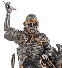 Там же, с правой стороны, можно заметить длинный колчан со стрелами и старинный клинок в изящно украшенных ножнах. Статуэтка имеет темно-серый цвет, а некоторые элементы одежды седока и сбруя коня покрыта позолотой.