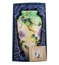 Фарфоровая ваза «Камелия» ярко украшена цветочным орнаментом. Большие сиреневые цветы умело сочетаются со светло-зелёным основным фоном. Она может служить в качестве самостоятельного украшения, так как имеет большой размер и привлекательное цветочное оформление.