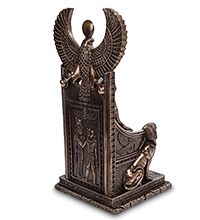Ее трон украшает синий беркут с золотым шаром на голове. У Бастет человеческое тело, но голова кошки. Как известно, кошки – веселые и любящие создания, а кошка считалась в древнем Египте священным животным; возможно, Бастет покровительствовала и кошкам? Любопытно, что ее подножье трона украшено сфинксами, имеющими человеческую голову.