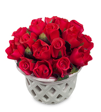Но эти цветы – не живые, они не распустятся, зато и не завянут через несколько дней, не потеряют свой вид: эта ослепительно белая корзиночка с яркими розами будет долго украшать вашу комнату.