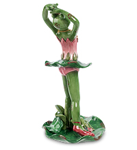Эта фарфоровая лягушка выступает в образе балерины. Соответствующая балетная одежда, туфли-балетки и все движения вполне соответствуют классическому балету. На груди – золотая цепочка с кулоном в виде стрекозы. Но выступает она у себя дома, на родном болоте, на большом листе водяного растения, среди цветов лотоса. Подарив такую фигурку начинающей балерине, вы ее не с лягушкой сравните, а пожелаете стать такой же стройной и элегантной: вот даже лягушка так может, а ты еще лучше сделаешь, если будешь тренироваться. Искусство балета способно преобразить мир, и не так уж важна зеленая кожа этой балерины.