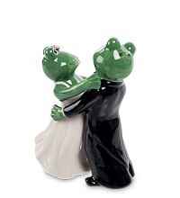 Эта пара зеленых пучеглазых лягушек предстает перед нами в образе молодоженов, танцующих свой свадебный вальс. На ней – белое свадебное платье и венок из цветов на голове, он – в строгом черном костюме. Прекрасная парочка даже на обеденном столе будет выглядеть оригинально и привлекательно. Но любой из сидящих за столом будет стараться их на время между собой разлучить. Оба молодожена выполняют особую функцию – солонки и перечницы. Почетная задача, вот только бы не разбирали поодиночке. А ведь придется: мало кому надо и солить и перчить блюдо одновременно. Но ничего, встреча неизбежна и разлука долго не продлится.
