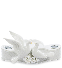 Очень символический подсвечник. В нем можно установить три свечи – две тоненьких и одну толстую. Похоже, это можно расшифровать как две души, которые, слившись воедино, дают начало новому и очень сильному чувству – любви. Оформление подсвечника тоже говорит о любви: на двух цветках розы уселась влюбленная пара голубей. Голубь воркует, распустив свои крылья, объясняется со своей голубкой, а та буквально глаз с него не сводит. Подарок такой – это или знак любви, обещание романтических отношений, или их пожелание, если его дарят друзья влюбленной паре или молодоженам.