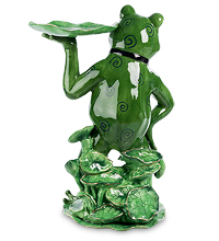 Керамическая «Лягушка» освоила новую профессию: теперь она обслуживает посетителей ресторана. Она нарядилась в черный галстук-бабочку, неизменную деталь туалета официантов приличного заведения, а для готовых блюд ей выделили вместительный лист кувшинки. Как и все приличные официанты, Лягушка доброжелательна, вежлива, и терпелива. Судя по позе, в которой героиня ожидает заказа клиента, кормят в ресторане хорошо, а клиенты довольны и пищей, и обслуживанием.