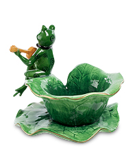 Романтический ужин при свечах предполагает наличие романтичного подсвечника. Ну, вот такого, например. Основа композиции – большой зеленый лист водного растения. Второй такой же свернут в чашу и является опорой для свечки. Перед ним – яркий, розовый цветок лотоса с тщательно выполненными фарфоровыми лепестками. А на краю подсвечника устроилась лягушка-музыкант с черной бабочкой на шее, играющая на гитаре. Вот такое бардовское музыкальное сопровождение вечера – чем не романтика? Так пусть лягушонок играет вам весь вечер – его музыка будет звучать только в вашей душе и не помешает тихой беседе при свете свечи.