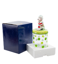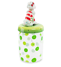 Отличным примером кухонной утвари с душой можно смело назвать банку для сыпучих "Пудель", которая станет отменным вместительным помощником и броским красивым предметом декора одновременно. Цветовая гамма милой баночки – «цирковая», прозрачное стекло основы украшают яркие зелено-салатовые круги, на крышке в мелкую черную крапинку сидит красно-белый пудель.