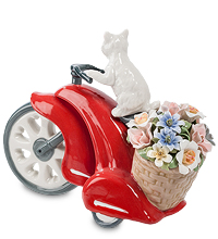 На экстравагантного вида байке с огромным передним колесом и маленькими задними, напоминающими старинные велосипеды, за рулем сидит маленький беленький щенок. Именно он выступает в роли развозчика цветов – их на багажнике байка целая корзина. Тончайшие фарфоровые лепестки кажутся живыми и воспринимаются как красивый цветочный подарок. Но этим особенности композиции не исчерпываются: это ведь музыкальная фигурка, и стоит только завести механизм, как зазвучит музыка, и щенок-развозчик поедет дальше радовать своими цветами других людей. Отличный сувенир в подарок – красивый и к тому же музыкальный. Он станет оригинальным украшением комнаты.