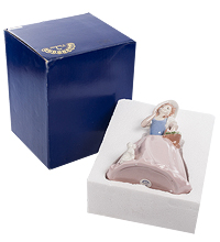 Фарфоровая статуэтка «Девочка с корзиной» дает представление о прогулках дам в старинных платьях. Хотя статуэтка изображает юную особу, она, как и дамы постарше, вышла на прогулку с корзиной цветов, и выглядит очень эффектно. Девочка еще очень молода, поэтому любознательна и даже любопытна. Пока она рассматривает что-то (или кого-то), маленький белый пудель устроился на подоле ее длинной розовой юбки.