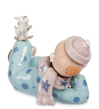 Маленький клоун улегся на полу. Почему клоун? Только потому, что он нарисовал на своих щеках алые сердечки? А так он скорее похож на мальчишку, собравшегося на лыжную прогулку – на нем комбинезон и шарфик с шапочкой. А вот и его помощник – зайчонок на лыжах. Это, наверно, мальчик играет в клоуна, собираясь показать какую-то шутку, связанную с катанием на лыжах. И пусть он не на манеже цирка, а его помощник – просто игрушка, все равно явно получится что-то забавное. Если человек с детства мечтает стать цирковым артистом, подарите ему такой забавный талисман – он наверняка поможет отточить клоунское мастерство и достичь успехов.