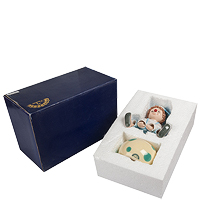 Клоун уселся верхом на огромный мяч и готовится повеселить зрителей. Из всей клоунской раскраски на его лице только характерная красная нашлепка на кончике носа. Шапочку с козырьком он развернул вбок – так забавнее. Но он не просто сидит на мяче и даже не прыгает через него. Эта фигурка – не простая, а музыкальная, и если завести ключиком пружинный механизм, будут звучать звуки музыки, а клоун на мяче начнет вращаться. Совершенно неожиданное действие, зато смотрится действительно смешно. И пусть этот клоун только учится выступать на цирковой арене, он еще мальчишка, который только мечтает о цирке, но номер у него явно получился.