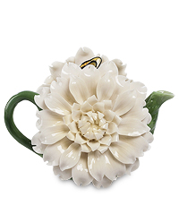 Этот заварочный чайник как будто решил спрятаться между роскошных цветов. Две белые хризантемы прикрыли его корпус так, что из-за них видны только носик и ручка, выкрашенные в зеленый цвет, как цветочные стебли. Да вверху между цветами присела на крышку чайника золотистая бабочка, которая имеет особое назначение – взявшись за нее, можно открыть крышку и загрузить в чайник порцию чая. Похоже, даже обычный чай приобретет аромат цветов, если его заварить и разлить по чашкам из этого чайника. А о том, что чайник украсит собой стол, за которым происходит чаепитие, и говорить не стоит. Просто, в лучшем стиле китайских традиций, к вкусу и аромату чая добавится еще и красота цветов!