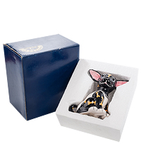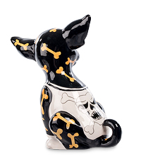 Изящная фарфоровая статуэтка изображает симпатичную собачонку породы Чихуахуа. Эта порода собак считается самой маленькой в мире, так что 12-сантиметровая статуэтка – лишь немного уменьшенное изображение. Но это не скульптурный проект, а фигурка для украшения комнаты, поэтому поверхность собачьей шкуры покрыта разными узорами – символическими косточками, изображениями жутких масок. Но собачка не обращает внимания на свою окраску – сидит, виляя хвостиком, и внимательно смотрит на всех окружающих добрыми глазами. Если человек любит собак, но по какой-то причине не может содержать их в доме, подарите ему такого песика!
