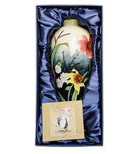 Ваза напоминает тёплый летний вечер, который хочется хранить в своей души постоянно. Теплые и нежные цвета хорошо сочетаются между собой, создавая вокруг вазы приятный ореол уюта. Фарфоровая ваза — это отличный дизайнерский ход.