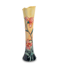 Её дизайн имеет горловину в виде звезды, а красные цветы покрывают всю поверхность изделия. Безупречно подобрана цветовая гамма – теплые тона превалируют над холодными, а основание вазы будто и вовсе отсутствует. Внутри она черного цвета, немного изогнутой формы, но сможет вместить несколько одиноких цветков. Это отличный подарок родным и близким людям или прекрасное дополнение к подаренным на первом свидании розам.