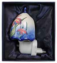 Компактный светильник, имеющий простую и удобную конструкцию. Удобная вилка для включения в бытовую электросеть, патрон для лампочки и фарфоровый абажур, украшенный росписью вручную. Сюжетом для изображений стал цветущий сад, цветы и листья, нарисованные на фарфоре, покрыты слоем прозрачной глазури.
