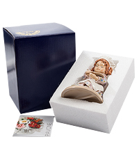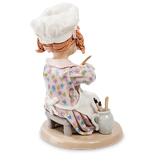 Этот фарфоровый малыш еще только учится рисовать, но к делу подходит с соблюдением всех правил. На голову надел белый колпак, поверх своей длинной рубашки – передник, тоже белого цвета. И уселся на небольшой табуреточке, явно перед холстом или просто перед листом бумаги, закрепленным на мольберте. В руках у него – самая настоящая палитра, на которой он может смешивать краски, подбирая нужный оттенок, рядом в баночке приготовлен целый набор кисточек. Взгляд художника серьезен и сосредоточен – он уже придумал, что будет рисовать и готов прямо сейчас нанести на свою будущую картину первый мазок.