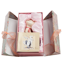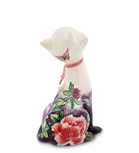 Высота сидящей на земле кошечки – 14 сантиметров. Ее шея украшена розовой ленточкой, а белая шкурка – красивым рисунком. Художник изобразил большие цветы на фиолетовом фоне, который переходит в черный цвет у лап животного. На красном цветке, нарисованном на груди статуэтки, изображена бабочка с желто-зелеными крыльями; левую переднюю лапку покрывают зеленые листья: издали кажется, что кошка присела отдохнуть на цветочной клумбе.