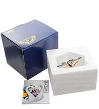Композиция «Бабочка на цветах», входящая в коллекцию торговой марки Pavone, является фарфоровым воплощением красоты живой природы. Изделие выполнено в виде миниатюрной бабочки, которая сидит на нежном цветочном бутоне. Крылья фарфоровой бабочки разукрашены настолько выразительно и искусно, что кажется, будто бы через мгновение насекомое взмахнет ими и улетит в поисках новых цветочных бутонов. Изделие расписано яркими акриловыми красками и украшено россыпью миниатюрных стразов, что придает его дизайну особую утонченность и выразительность.