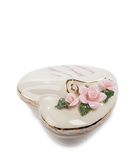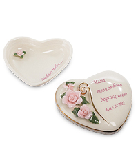 Эта маленькая фарфоровая шкатулочка предназначена для подарка самому близкому человеку для каждого – родной маме. На ней и слова написаны, говорящие о материнской любви. Форма шкатулочки напоминает сердечко – это тоже символ любви. О ней и цветы говорят, три миниатюрные розового цвета розочки с тончайшими фарфоровыми лепестками и зелеными листиками. Что поместится в такой шкатулке? Пара сережек, цепочка, колечко – вряд ли больше. Но не содержание важно, не количество драгоценностей, а это скромное, но искреннее признание в любви своей маме, в которой она и так не сомневается, но услышать еще раз ей будет очень приятно.
