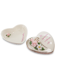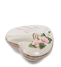 Вот отличный вариант: шкатулка. Белый фарфор с золотыми каемочками, несколько ярких цветов на крышке. Форма – конечно сердечком и надпись, в которой любимая сравнивается с прекрасной розой. Все, что нужно! Но имейте в виду: шкатулочку потом придется наполнять украшениями и драгоценностями. Готовы?