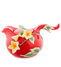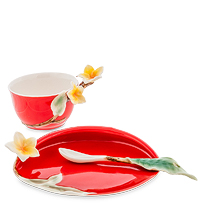 На ярко-красной поверхности сервиза – бело-желтые цветы тропического франжипана. Побеги вырастают из чашек, цветы распустились во всех направлениях, и даже ложечки имеют ручки, выполненные в форме листьев. Везде побеги, листья, цветы – жизнь бушует и приглашает на чаепитие. Поразительным контрастом выступает белая внутренняя поверхность, не мешающая оценивать цвет налитого в чашки чая. Из такой посуды можно пить только с праздничным настроением.