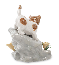 Маленький симпатичный котенок, беленький с коричневыми пятнами, играет среди цветов. Фарфоровые лепестки изумительно красивы, как живые, но котенок совсем ими не интересуется. Его интерес вызвала лягушка, которая выбралась из-за цветов на открытое место. Это уже что-то живое! И если взрослый кот подумал бы, что встретил добычу, то котенок видит в зеленой квакушке прежде всего партнера по играм. Вот только она почему-то не хочет убегать, а как же гоняться за тем, кто не убегает! Придется включиться в дело хозяевам котенка и затеять с ним веселую игру. Такую композицию можно подарить девушке, которая обожает котят, любит цветы и не боится лягушек!