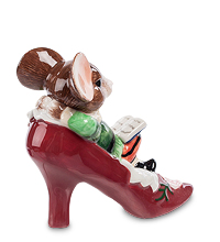 Керамическое изделие воплощает собой забавного мышонка, одетого в яркий зеленый костюм. Мышонок увлеченно читает книгу, по всей видимости, разучивая новую роль. Маленький герой этой статуэтки решил устроиться поудобнее и прилег внутрь хозяйской туфли.