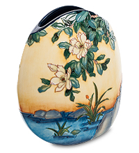 Фарфоровая ваза «Гейша» имеет оригинальную яйцевидную форму. Этот аксессуар имеет художественное оформление в японском стиле. На лицевой стороне вазы мы видим задумчивую девушку в свободно спадающем кимоно. Она сидит на ветви старой магнолии, которая как раз находится в фазе цветения. Помимо больших белых цветов магнолии наше внимание привлекает спокойное синее море, которое находится на заднем плане. На обратной стороне вазы изображены цветы и вода.