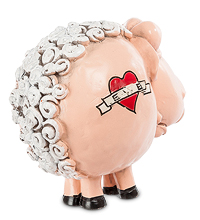 Вполне возможно, что эту овечку просто не достригли и так и отпустили с оставшейся шерстью на спине. Но ведь она изображает человека, а, значит, панковый вид – это так задумано. И рисунки с сердечками на боках, и кольцо в носу – все это атрибутика панков. Но как ни старайся, из доброжелательной овечки не получится суровый панк, сердитый на весь мир.