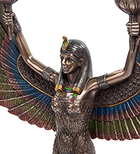 Богиня Исида одета в длинное полупрозрачное платье, почти не скрывающее ее женственную фигуру. На девушке нет обуви, зато ее руки, шея и голова украшены золотыми украшениями. В высоко поднятых руках Исида держит две чашечки для свечей, которые прекрасно смотрятся на фоне больших, покрытых синей и зеленой краской, крыльев. Богиня располагается на плоской круглой подставке; статуэтка сделана из полистоуна темно-бронзового цвета и имеет высоту 31 сантиметр.