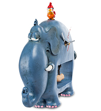 Эти необычные часы используют в качестве своего корпуса фигурку слона синего цвета, в которой сделана прорезь для маятника. Слон с толстым хоботом и маленькими бивнями смотрит вперед, совершенно не обращая внимания на то, что ему на спину уселась небольшая яркая красно-желтой окраски птичка с огромным, большим, чем она сама, клювом.