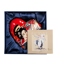Шкатулка «Гейша», сделанная из керамики, выполнена в виде сердца и покрыта красной краской. На крышечке изображена японка в традиционном женском наряде. Ее волосы красиво уложены и украшены шпильками необычной формы. Помимо японки в кимоно, на коробочке также изображено множество розовых лепестков сакуры.