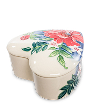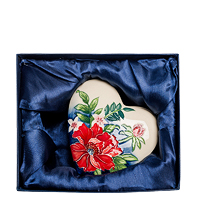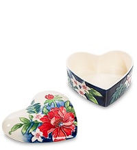 Стильная и оригинальная шкатулка в форме сердечка. Предмет изготовлен из белого фарфора и украшен изображениями прекрасных цветов и листьев. Поверхность покрыта блестящей глазурью. Такая шкатулка прекрасно подойдёт для хранения мелких памятных предметов, а также драгоценностей и украшений. Аксессуар поставляется в коробке с мягкой обивкой, и обивка, и коробка имеют тёмно-синий цвет.