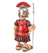 Статуэтка рыцаря при полном параде охраняет въезд в город или вход во дворец. На голове – шлем с пышным плюмажем, на ногах – сандалии: римская традиция боевой обуви. В руке – меч, в другой – копье. На посту разговаривать не позволительно, а вот смеяться – никто не запрещал. Что вызвало такую добрую улыбку на лице сурового воина?