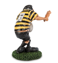 Суровая игра, бывает, не обходится без травм – вот и переднего зуба игрок явно на поле лишился, но это все отодвигается на задний план, когда наступает время атаковать соперников. Такие мужские статуэтки, изображающие спортсменов, можно коллекционировать, а если у вас есть знакомый, увлекающийся игрой в регби, подарите ему прикольную фигурку игрока в регби на день рождения!