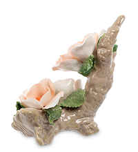 На корявом куске сухого дерева разместилась созданная в стиле японской икебаны очаровательная лаконичная композиция из трех чайных роз. Две побольше, и одна – еще почти бутон. Цветы настолько красивы и изящны, что так и хочется их понюхать. Но они не пахнут, ведь они не живые, а фарфоровые. Не обязательно дарить полные корзины цветов, да еще таких, которые завянут через пару дней. А вот такая цветочная композиция станет маленьким, но ярким элементом в вашей комнате, напомнит о поре цветения и о том, кто принес этот замечательный подарок. Это – украшение на долгие времена, память на всю долгую жизнь.