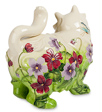 Сама по себе копилка белой кошки простая, но дополняют ее и делают дизайн неординарным яркий зеленый фон нижней части с безумно красивыми цветами и бабочками невероятной красоты. Миловидная кошечка сможет порадовать истинных любителей этих животных.