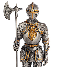 Статуэтка «Рыцарь с алебардой» понравится тем, кто интересуется историей средневековья или кому нравится старинный стиль оформления, который до сих пор можно встретить в замках, дворцах и старинных особняках. Фигурка имеет высоту 10,5 сантиметров и сделана из полистоуна серебристого цвета. Рыцарь изображен с алебардой – изящным топором с длинной металлической рукояткой. Это оружие часто применялось в первой половине прошлого тысячелетия и считалось универсальным средством против конницы: при помощи алебарды можно было поразить не только лошадь, но и седока, стащив его с коня. При помощи алебарды можно было пробить даже самые прочные доспехи, и нанести противнику серьезные раны.